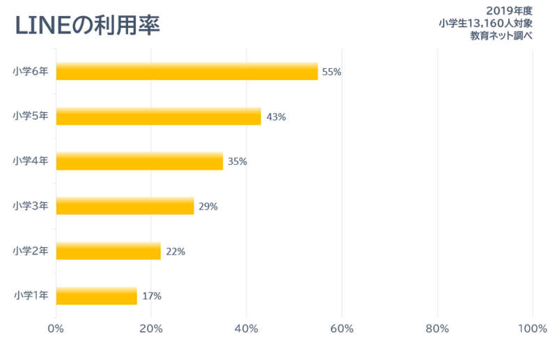 2020年1月7日: 小学生13,160人を対象に教育ネットが実施した「ネット利用における実態調査結果」によると、小学生全体の「LINE」利用率の平均は34.8%、6年生の利用率は55.3%にのぼることがわかった。LINEは10月24日の発表でiOS版の推奨年齢を4歳から12歳以上に引き上げる動きがあるため、iOSを用いたLINEの利用については今後推奨年齢外の利用となる可能性がある。 調査対象は関東圏内を中心とする小中学生20,483人で、調査期間は2019年4月から7月の三ヶ月間。