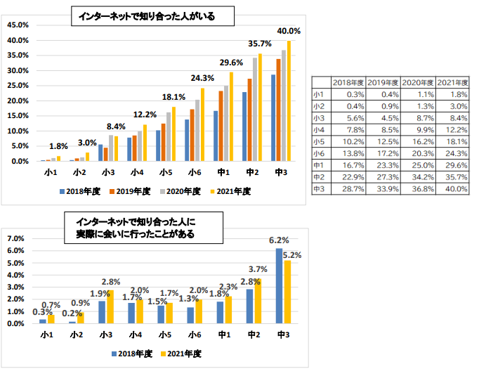 22022年4月26日: 株式会社教育ネット(神奈川県横浜市都筑区 代表:大笹いづみ)が実施している「ネット利用における実態調査」(2021年4月~12月実施分)にて、「インターネットで知り合った人がいる」と回答した児童生徒の割合は年々増加傾向にあり、学年が上がるにつれ、数値が高くなっていることがわかった。これは様々なSNSやオンラインゲームなどが普及し、ネット上での出会いが子ども達にとって、日常的になっているからだと考えられる。また、「インターネットで知り合った人に実際に会いに行ったことがある」と回答した児童生徒は2021年度は全体で2.4%だった。これは、42人に1人がネットで知り合った人に会ったことがあるということになる。また、2018年度調査結果と比較すると、小学3年生と中学2年生が一番増加しており、0.9ポイント増加。次に小学2年生、6年生が0.7ポイント増加している。インターネットを通じた繋がりは利点もあるが、若年層は悪意にさらされるリスクもあることから、自己防衛の自覚を促す必要性があると考えられる。